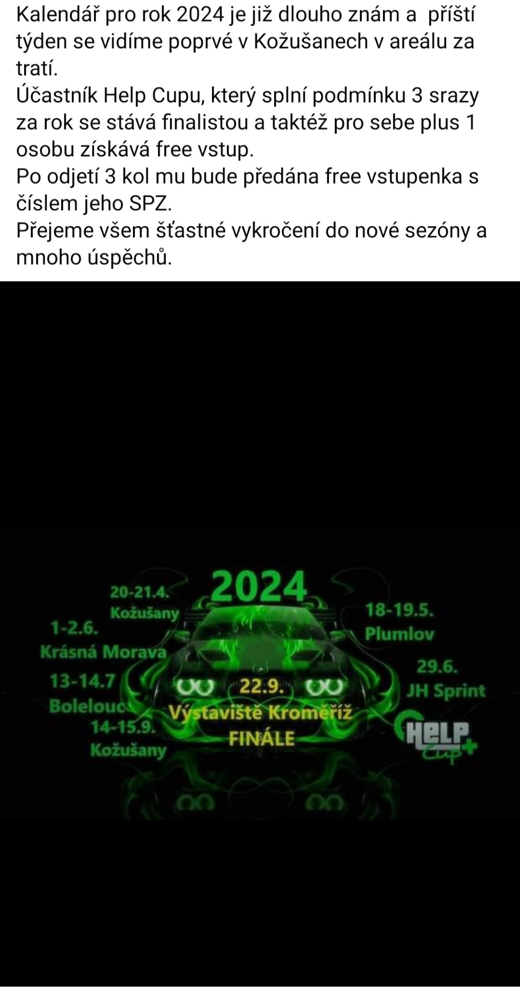 Tak máme za sebou zahajovací kolo Help cupu a dle mého se opět povedlo.A asi jste si všimli že došlo k nějakým změnám.Tak se teď trochu vykecám a dávejte dobře pozor ať se nemusím opakovat.Ta srazovka co jste dostali u vstupu po zaplacení,má na sobě číslo a pod ním se mi budete hlásit do registrace na všech dalších kolech a ročnících dokud nebudou zase nějaké jiné.Vím že se opakuji , ale najdou se tací co si to do teď nezapamatovali.Jo a to starý si můžete zarámovat nebo strčit do ...JO a ještě něco.Ti co nesoutěžili a mají číslo ,tak sem napište jméno,typ auta a rok výroby ať to můžu zapsat do seznamu.Děkuji.